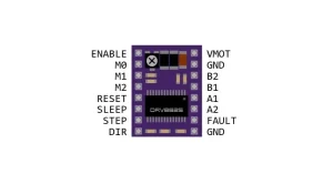 Pines de control de entrada (STEP, DIR, ENABLE, M0, M1, M2) para el manejo del motor.