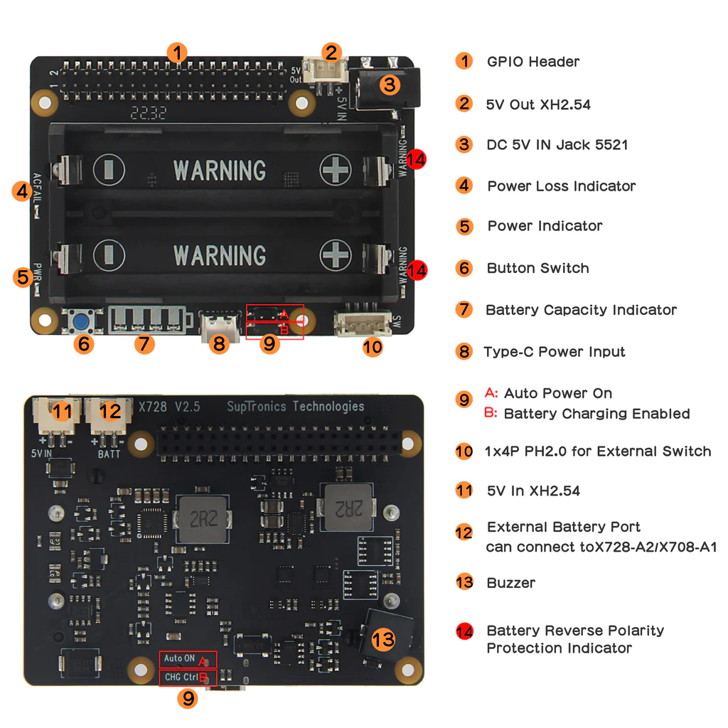 Gestión de energía: Incorpora un circuito de gestión de carga que permite cargar la batería mientras alimenta la Raspberry Pi y protege contra sobrecargas, sobredescargas y cortocircuitos.
